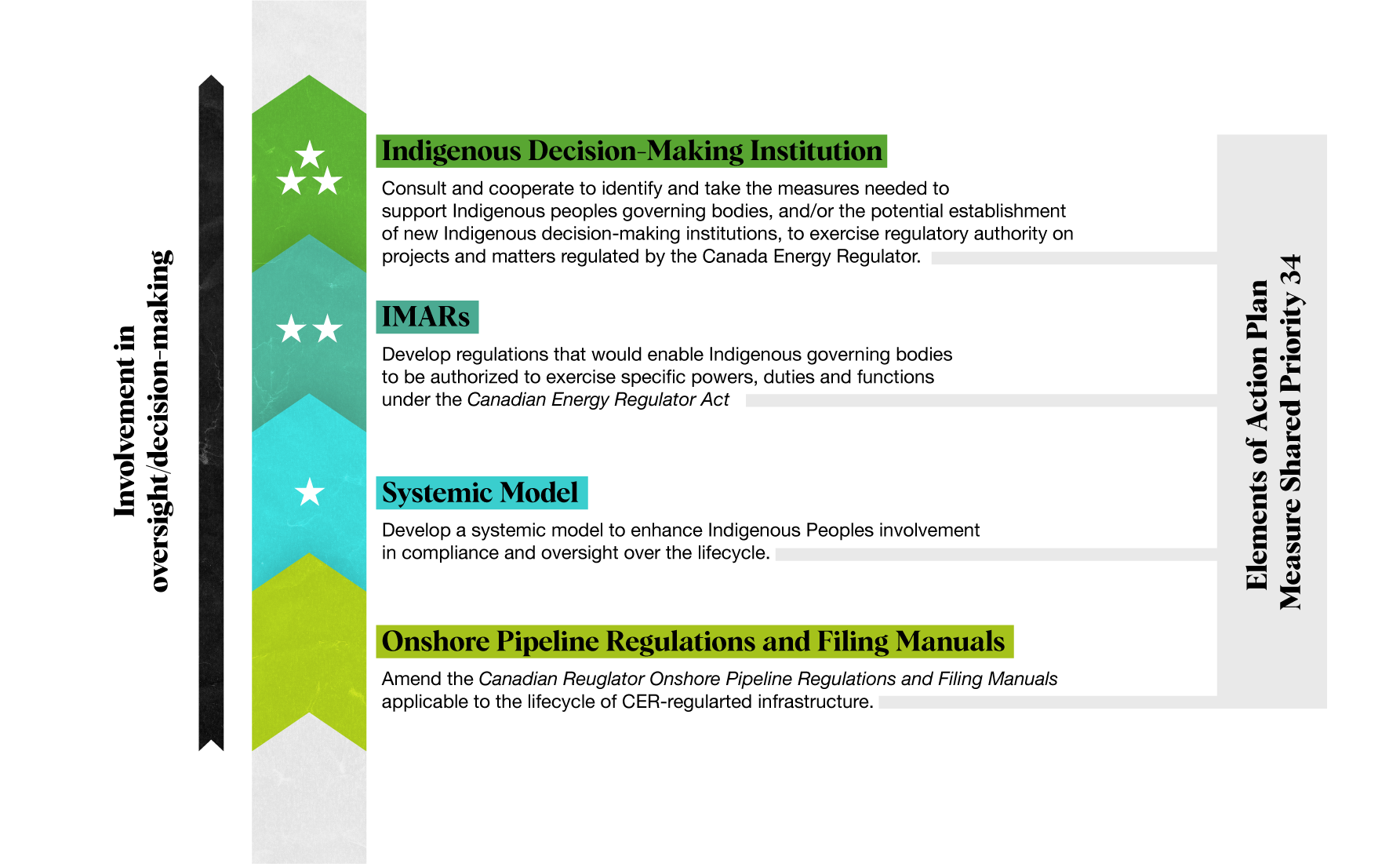 Text description: The image is a flow diagram titled Elements of Action Plan Measure Shared Priority 34, which illustrates a four-tiered progression of Indigenous involvement in oversight and decision-making for energy projects. An upward arrow indicates that authority increases from the bottom level to the top.